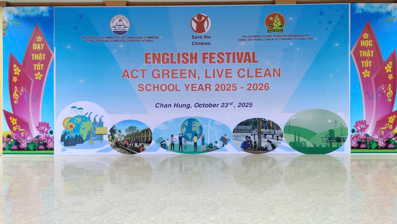 Nhằm nâng cao nhận thức cho học sinh về ý thức bảo vệ môi trường, ứng phó với biến đổi khí hậu và tạo sân chơi bổ ích, giúp các em rèn luyện kỹ năng sử dụng tiếng Anh trong các hoạt động thực tiễn, Trường THCS Đông Tây Hưng đã tổ chức chuyên đề truyền thông “Bảo vệ môi trường – Phòng chống biến đổi khí hậu” kết hợp với Lễ hội Tiếng Anh “Sống sạch – Hành động xanh” vào ngày 23 tháng 10 năm 2025.